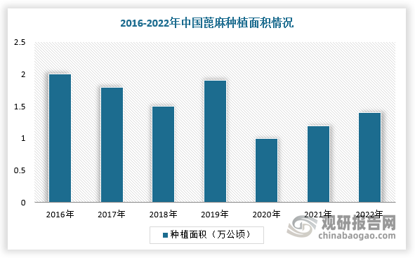 近几年,受蓖麻种植地减少、劳动力不足等因素影响,我国蓖麻种植面积持续减少。根据数据显示,2000年我国蓖麻种植面积达29万公顷,到2022年仅1万多公顷了。